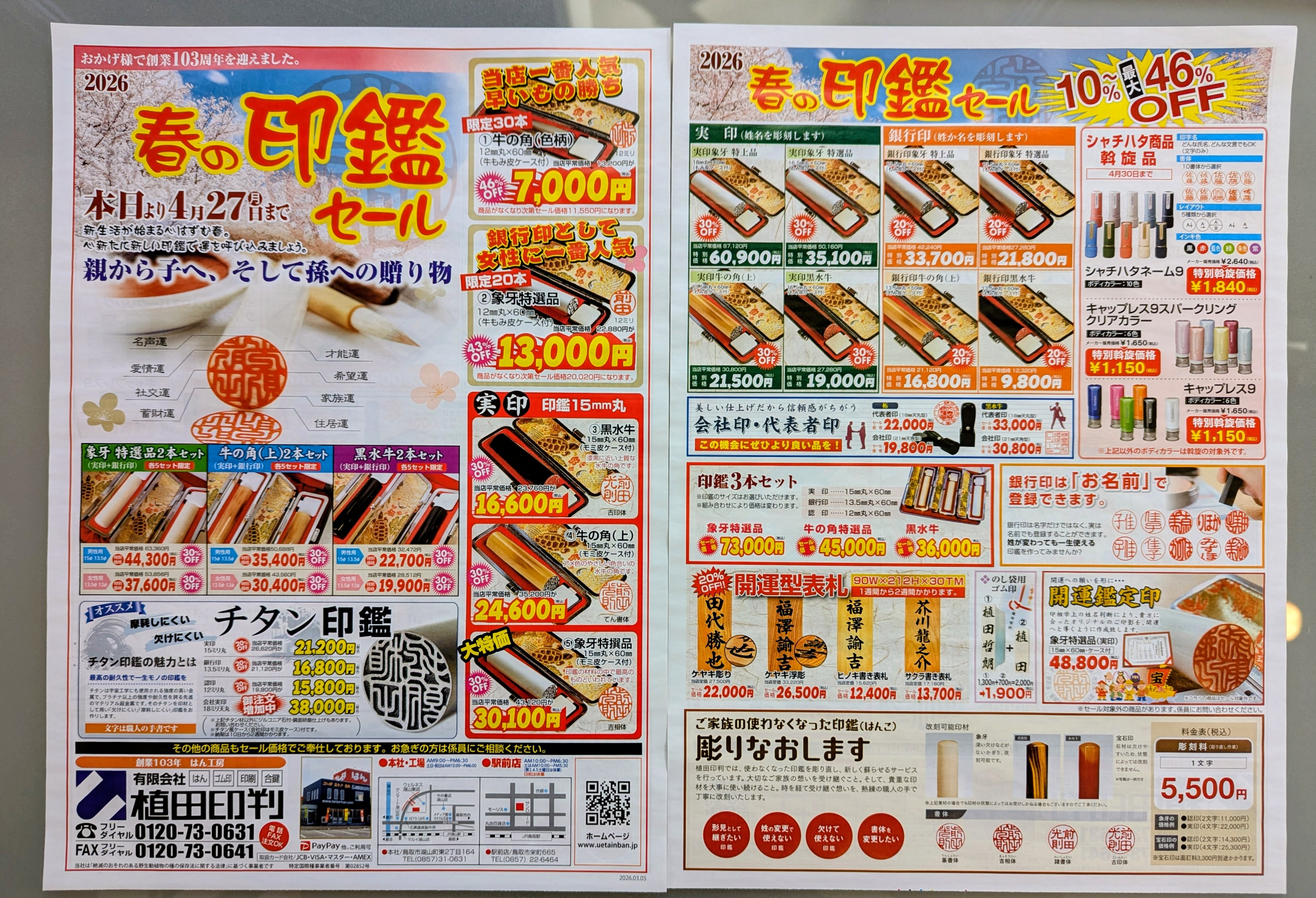 シャチハタ協賛のネームを揃えておりますのでチラシに目を通してください